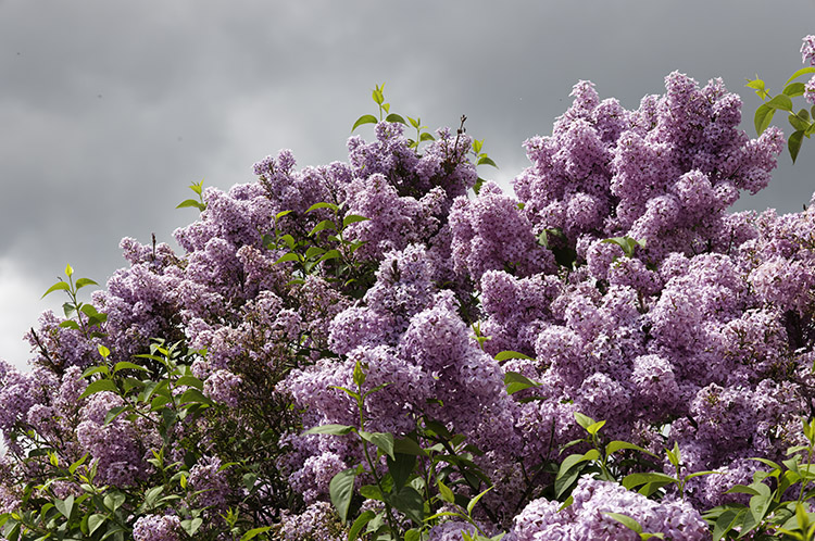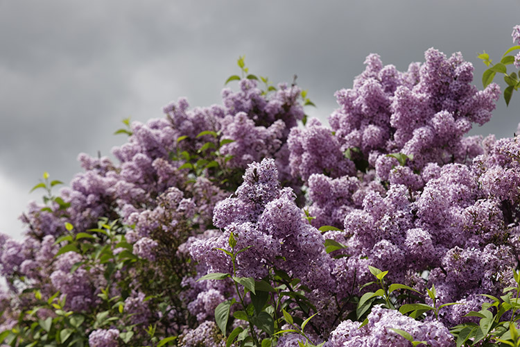 Blühender Flieder. Die Schärfentiefe ist zu gering, um den Fliederstrauch insgesamt scharf aufzunehmen.
