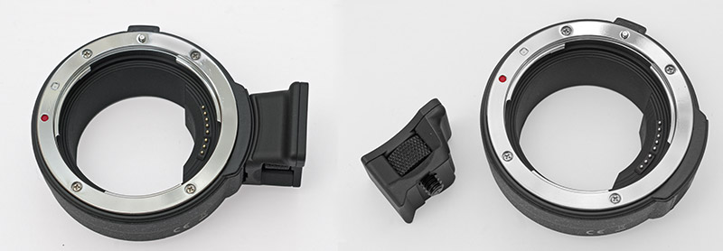 Um Objektive mit EF oder EF-S Anschluss an Kameras mit RF Bajonett zu montieren, gibt es Adapter von Canon und Drittherstellern. Die Kommunikation zwischen dem Gehäuse und den Objektiven erfolgt über elektronische Kontakte, die von den Adaptern durchgeschliffen werden. Offenbar hat sich durch den neuen EOS R Anschluss die Steuerung der elektronischen Funktionen in den Objektiven nicht verändert. EF(-s)-Objektive lassen sich mit Adapter am RF Anschluss genauso verwenden wie an einer EOS DSLR.Beim Test einer Canon EOS RP im Jahr 2019 verwendete ich den EF/EOS R Adapter von Canon. Wie erwartet, funktionierte er ausgezeichnet. Ich vermisste an ihm allerdings einen Stativanschluss. Deshalb bestellte ich diesmal einen ‚Auto Focus Adapter EF-EOS R‘ (50 € / 88 g ohne Stativanschluss, ) von mmlite mit einem abschraubbaren Stativanschluss. Er ließ sich wie das Original anschließen, wackelte nicht und verband das zum Testen verwendete Telezoom Canon 100-400mm IS USM einwandfrei mit der Canon EOS R5.