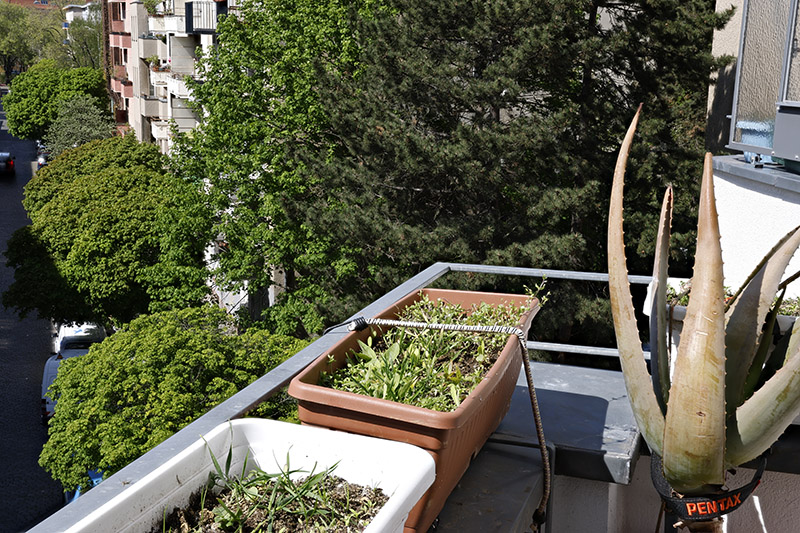 Bild aus einer Fokus-Bracketing-Serie aus 22 Einzelfoto. Ein Teil des Balkons ist scharf. Der Hintergrund ist unscharf.