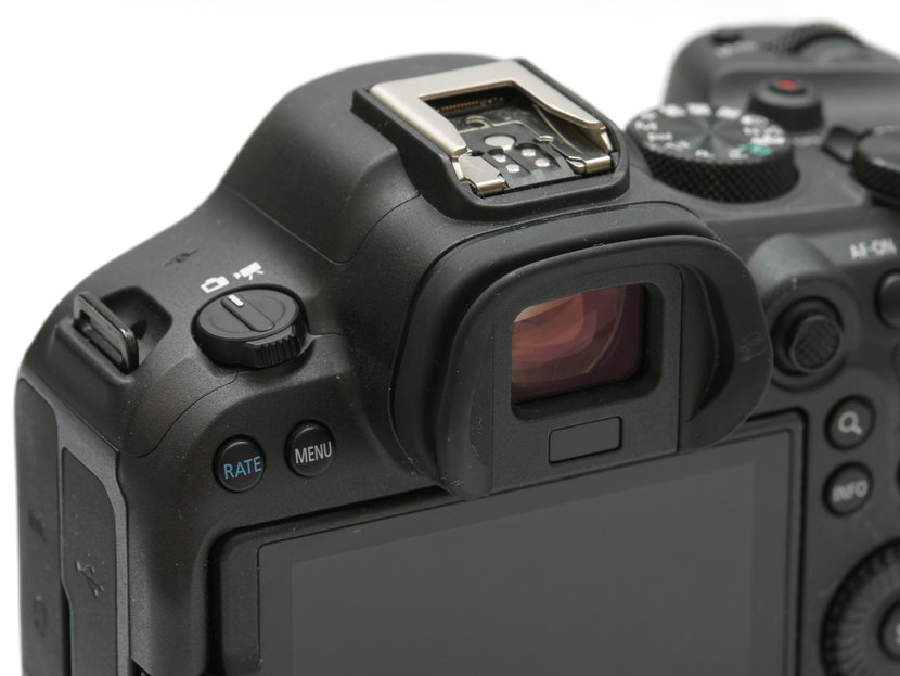 Rückseite. Oberhalb des schwenkbaren Displays findet sich der elektronische Sucher mit weicher Augenmuschel aus Gummi und einem Sensor, der feststellt, ob man in den Sucher blickt oder nicht. Falls nicht, wird das Bild auf dem Display angezeigt. Rechts neben den Sucher befindet sich ein Joystick, mit dem Autofokusfelder verschoben werden können. Das Display ist ein Touchscreen.