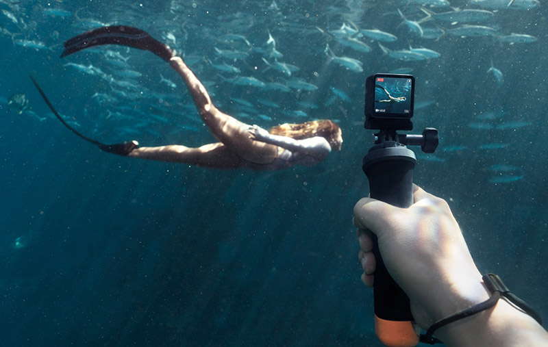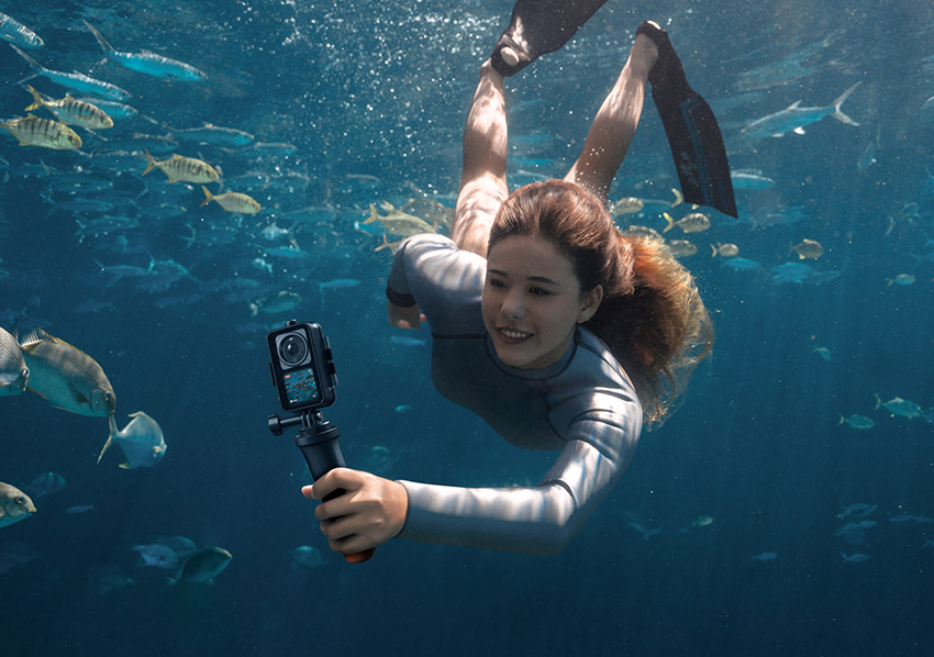 DJI Action 2 mit Bildschirmmodul und Griff beim Schnorcheln. Foto von: DJI