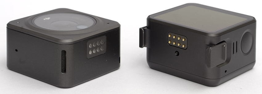 Der Magnet des Hauptmoduls bietet die Möglichkeit, es an magnetische Oberflächen anzuheften. Das ist riskant, weil an der Magnetseite auch die elektronischen Kontakte sind, um Verbindungen mit zusätzlichen Akkus oder dem Bildschirmmodul herzustellen. Es ist deshalb wohl keine gute Idee, diese Seite auf eine blanke Metalloberfläche aufzusetzen. Andererseits dürfte DJI eine Sicherung vor Kurzschlüssen eingebaut haben, weil es in der Praxis gar nicht auszuschließen ist, dass die Kamera auch mal auf Metall abgestellt wird, beispielsweise einen Bistrotisch aus Alu. Testen möchte ich diese These allerdings nicht.