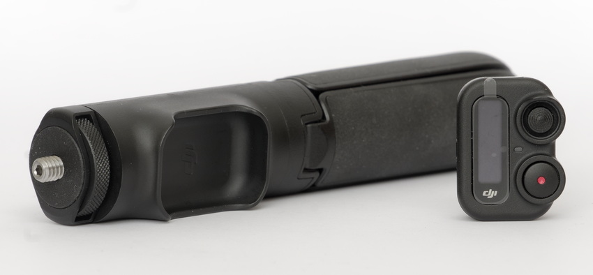 DJI Action 2 remote control extension rod. Verlängerungsstab mit ausklappbaren Stativbeinen und Fernsteuerung, die magnetisch in der Schale am Griff befetigt wird.