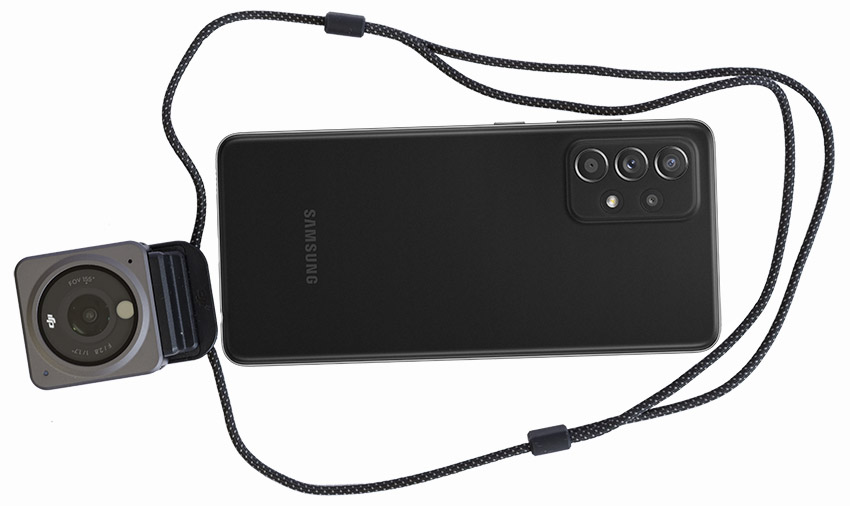 Größenvergleich: DJI Action 2 an der magnetischen Basis am Halsband neben einem Smartphone Samsung Galaxy A52