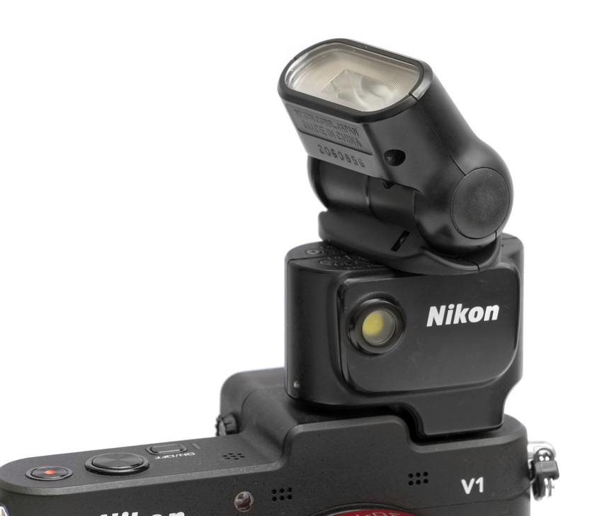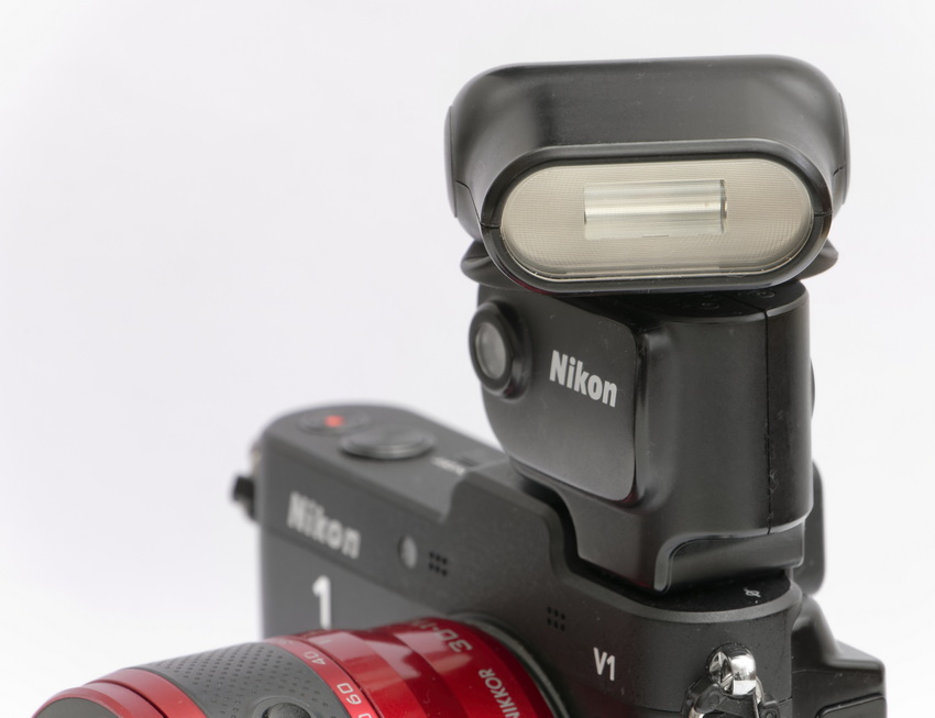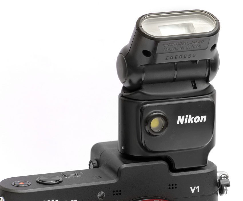 Das SB-N5 ist geradezu winzig und benötigt keine Batterien. Es wird aus dem Kameragehäuse mit Strom versorgt. Im ersten Moment scheint das paradox zu sein, zumal die V2 und V3 eingebaute, ausklappbare Blitzgeräte enthalten. Die V1 hat aber keines an Bord.