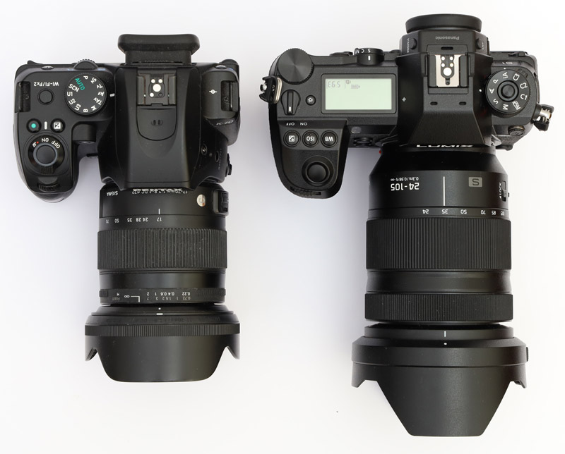 Zum Vergleich: Eine Pentax K70 mit dem kleineren APS-C Sensor und einem Sigma 2,8 - 4 / 17- 70 mm wiegt betriebsbereit 1178 g. Nur das Gehäuse mit Speicherkarte und Akku bringen 689 g auf die Waage. Der Unterschied ist deutlich zu spüren.