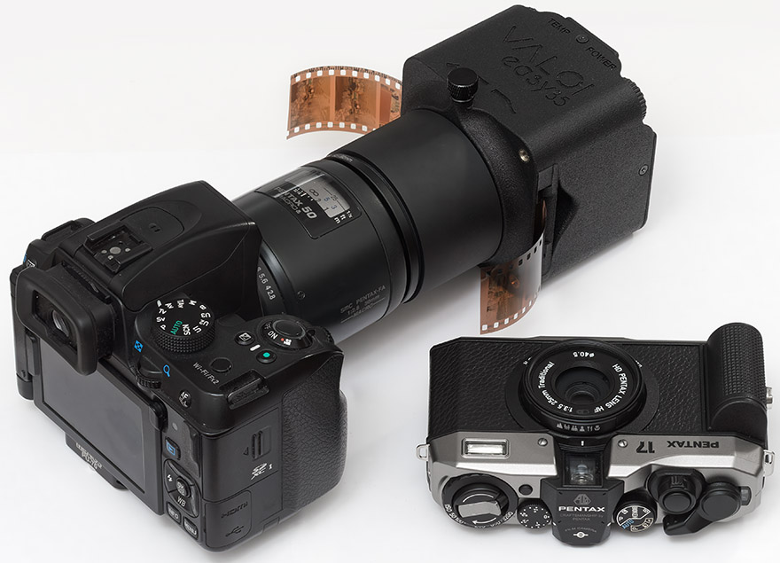 Pentax K-70 mit smc Pentax-FA 1:2.8 / 50mm Macro am VALOI easy35. Wenn das Objektiv robust genug ist, um den Tubus und den Filmhalter inklusive der LED Beleuchtung zu halten, ist das eine einfache und gute Lösung zum Scannen mit der Digitalkamera. Anders als bei vielen Filmscannern, kann die Schärfe optimal eingestellt werden. Durch Abblenden lassen sich auch gewölbte Filme insgesamt scharf abbilden.