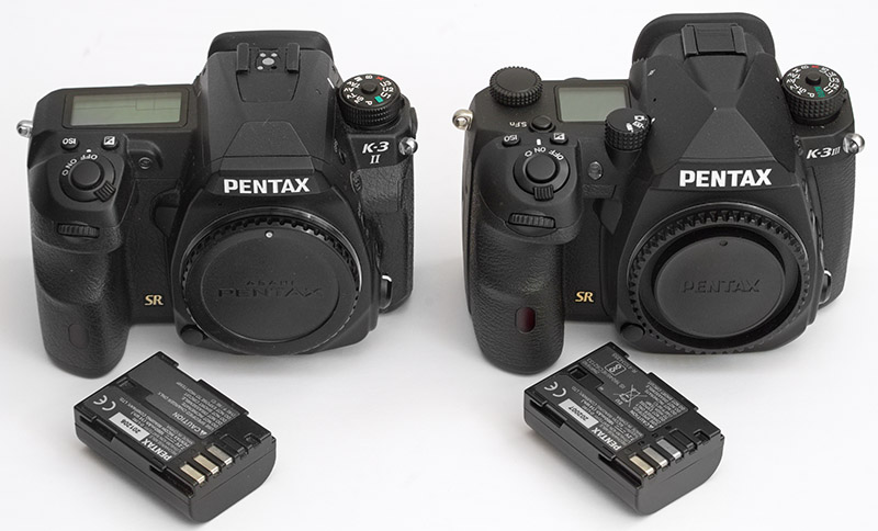 Pentax K-3 II (links) neben der Pentax K-3 III. Erfreulich: Beide Kameras verwenden den gleichen Akku. Die Ähnlichkeiten der Gehäuse sind unverkennbar.