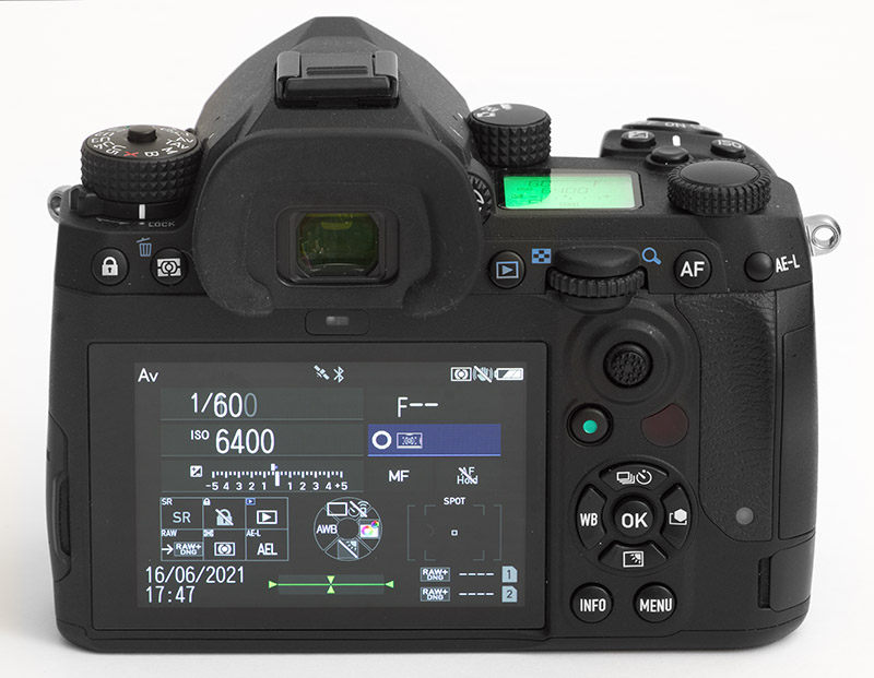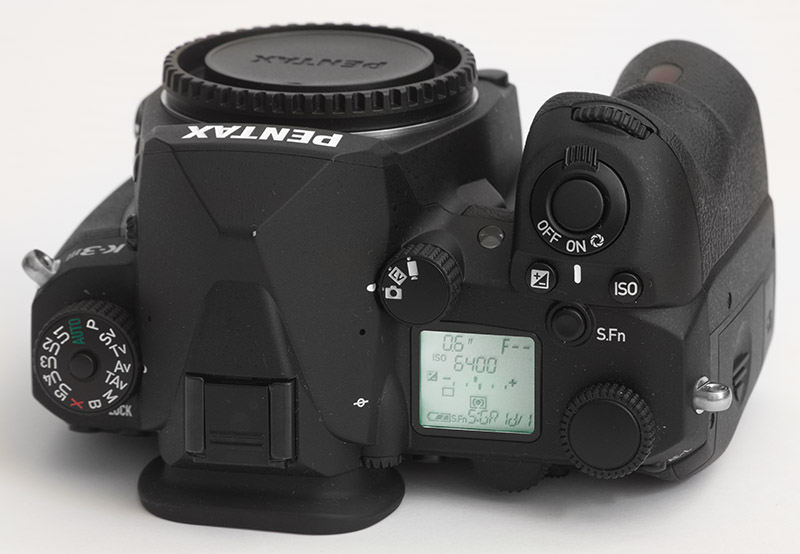 Oberseite der Pentax K-3 III. Erst nach der Bildbearbeitung fiel mir auf, dass die Belichtungsautomatik AV für ISO 6400 bei aufgesetztem schwarzen Deckel und verschlossenem Suchereinblick (durch Auflage auf dem Tisch) 0,6 Sekunden Belichtungszeit einstellte. Wäre mir das vorher nicht entgangen, hätte ich das Foto mit einem anderen Deckel wiederholt, um zu prüfen, ob der erste etwas Licht durchließ, ev. in Infrarot nahe dem sichtbaren Spektrum, das noch die Belichtungsmessung beeinflusste.