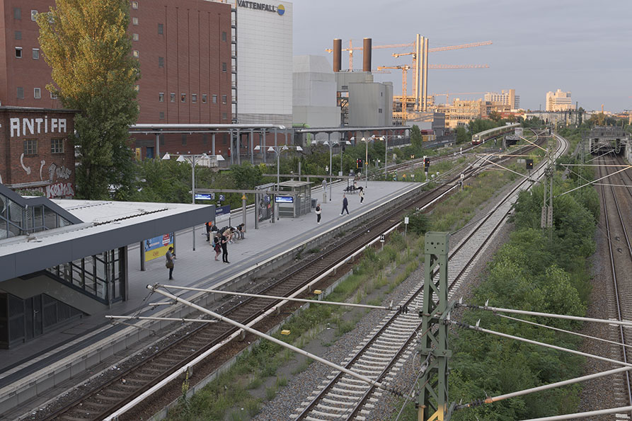 5. 8. 2023. Berlin. Blick von der Putlitzbrücke auf die Gleise neben dem Kraftwerk Moabit. Testmotiv am Abend kurz vor Sonnenuntergang. Die Gleise und die S-Bahnstation befinden sich bereits im Schatten einer Brücke und diverse Gebäude.