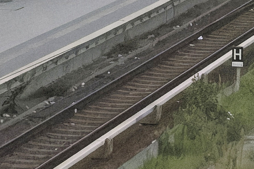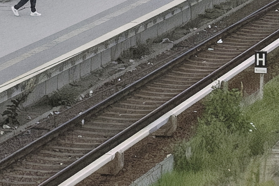 Die wesentlichen Details sind noch gut erkennbar, aber das Wort 'Kurzzug' auf der Tafel unter dem 'H' ist nicht mehr eindeutig zu lesen. Die Struktur des Gerölls im Gleisbett stimmt mit der Darstellung bei niedrigen ISO-Werten nicht mehr überein. Ganz feine Details gehen verloren.