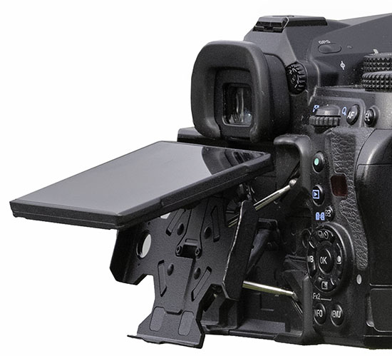 Die Pentax K-1 II erfüllt solche Wünsche mit einem raffinierten Mechanismus, den ich von anderen Herstellern so nicht kenne. Eine Display-Halterung lässt sich an vier verschiebbaren Streben in verschiedene Positionen etwas drehen und schwenken. Darüber hinaus kann das Display selbst von dieser Halterung stufenlos nach oben geklappt werden. Um das Display um 90° nach oben zu schwenken, muss seine Halterung an den Streben ein bisschen vom übrigen Gehäuse weggezogen werden.