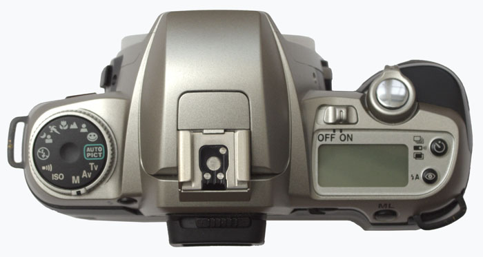 Pentax MZ-7. Oberseite mit den Bedienelementen. Das Wählrad bietet allerhand Belichtungsprogramme. Wer nutzt sie wirklich?