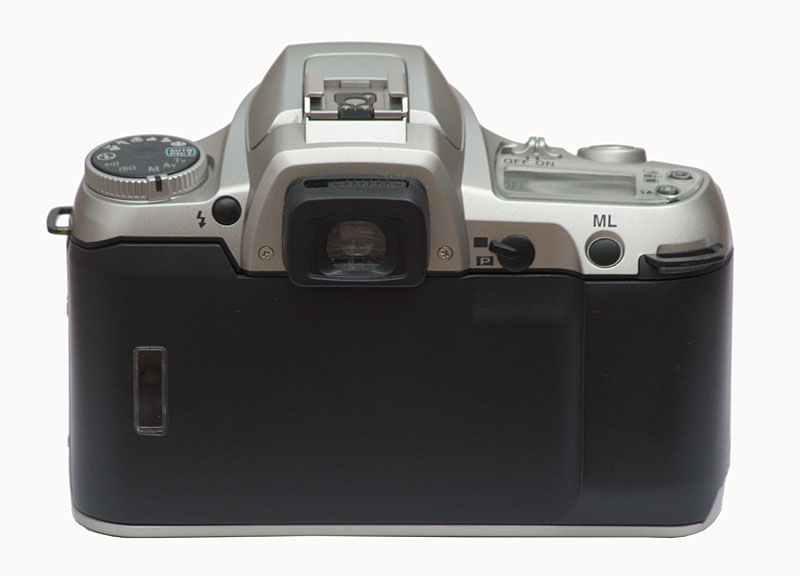 Rückseite der Pentax MZ-7. Hier finden wir einen P Schalter für Panoramafotos. Das ist eine der schlimmsten Funktionen, weil damit nur Masken oben und unten jeweils einen Streifen des Films abdecken und somit nicht 24x36mm belichtet werden, sondern 14x36mm. Totaler Schwachsinn, aber wenigstens sieht man im Sucher, wenn die Panoramaoption aktiviert ist, so dass man das mitbekommen müsste und nicht unbeabsichtigt einen Film mit starkem Beschnitt der Fotos belichtet.