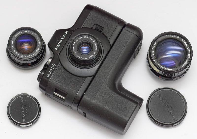 Pentax auto 110 mit 24mm, 18mm und 50mm Objektiven und Winder.