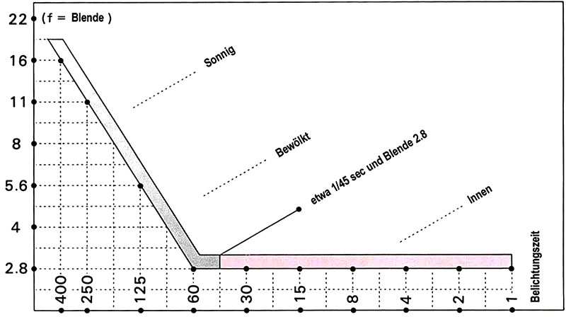Belichtungsprogramm der Pentax auto 100 super. Die Kamera stellt sowohl die Blende als auch die Belichtungszeit selber ein. Die Grafik mit den möglichen Kombinationen stammt aus der Bedienungsanleitung.