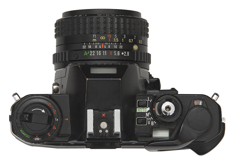 Pentax super A. Auf der Oberseite taucht erstmals ein kleines LCD Dispaly auf, das die Belichtungszeit anzeigt.