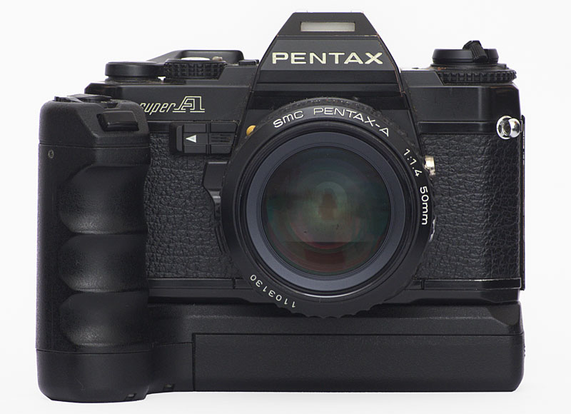 Pentax super A und Pentax program A. Zwei sehr ähnliche Kameras. Die program A wirkt mit ihrem kantigen Prismengehäuse plastikmäßiger und hat als kürzeste Belichtungszeit 1/1000 s, während die super A mit 1/2000 s belichten kann. Beiden haben den gleichen abschraubbaren Handgriff auf der linken Vorderseite. Hier ist die super A ohne ihn dargestellt.