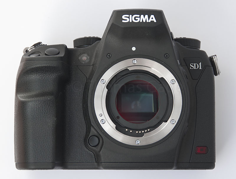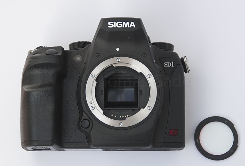 Sigma SD1. Die Vorderseite ist unspektakulär abgesehen von einer Besonderheit. Hinter dem Bajonett befindet sich ein Filter, der den dahinterliegenden Raum vor Staub schützt. Die Oberfläche des Filters ist leicht zugänglich und somit gut zu reinigen. Zugleich ist sie weit genug vom Sensor entfernt, als dass winzige Staubpartikel einen sichtbaren Effekt auf das Ergebnis hätten.