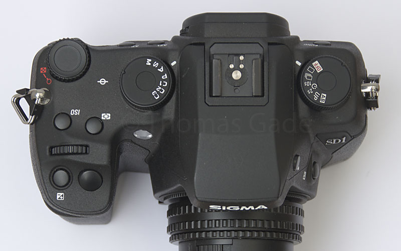 Die Oberseite der Sigma SD1 birgt keine Geheimnisse. Es gibt ein Einstellrad für Belichtungsprogramme und ein weiteres zum An- und ausschalten und Einstellungen zum Auslösen, wie Selbstauslöser, Einzelbild- und Serienaufnahmen. Seltsamerweise befindet sich auf der Oberseite kein zweites Display, das diverse Einstellungen auf einen Blick vermittelt. Das ist merkwürdig, weil die ältere Sigma SD15 bereits ein beleuchtetes Display hatte.