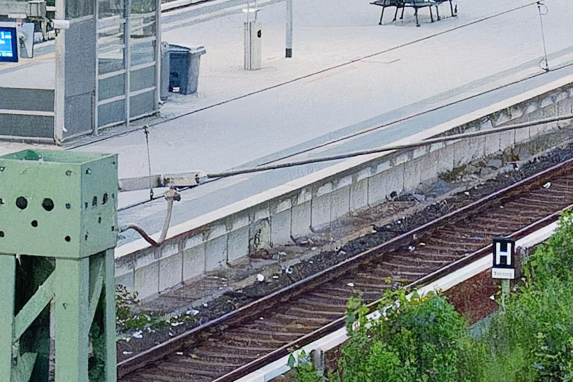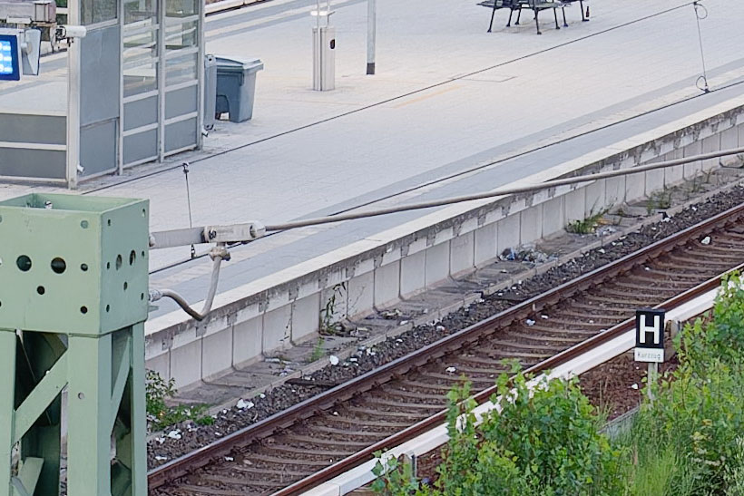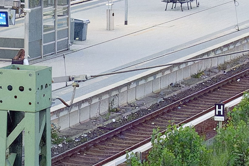 Testmotiv: Berlin. Blick von der Putlitzbrücke auf die S-Bahnstation Westhafen und Gleise nach Sonnenuntergang. Dieses Motiv wurde mit ISO Werten von 50 bis 102400 fotografiert, um die Qualitätsveränderung durch ansteigende ISO-Werte zu verfolgen.