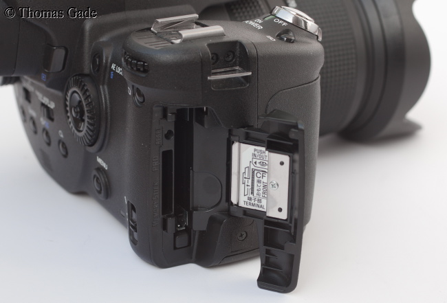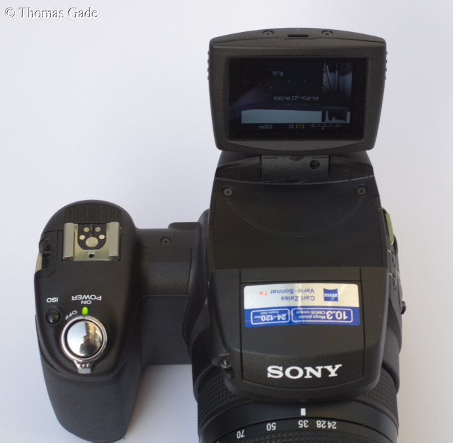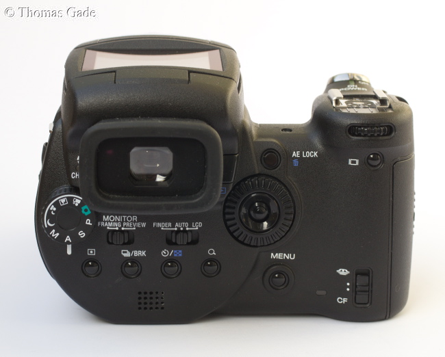 'Die Kamera hat Steckplätze für Compact Flash und Sony Memory Stick Pro Speicherkarten. Auf der Rückseite des Gehäuses, rechts unten, ist ein Schalter zur Wahl der Speicherkarte.