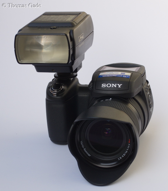 Die Kamera ist kompatibel mit alten Blitzen. Ein alter Metz mit Mittenkontakt und eigener Meßtechnik harmonoiert einwandfrei mit der Sony DSC-R1. Im Menu wird gewählt, ob der interne oder ein externer Blitz verwendet wird.