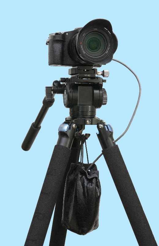Energiesorgen Adé. Die Sony RX10 IV wird von einer Powerbank in einem Beutel am Haken des Stativs mit Strom versorgt.