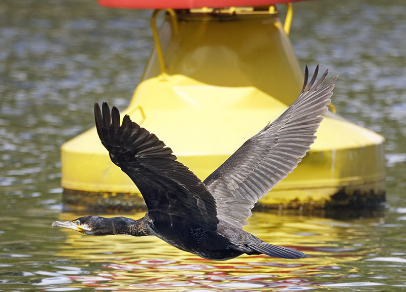 Mai 2021. Fliegender Kormoran über der Havel. Freihändig vom leicht schankenden Boot mit 800 mm Brennweite fotografiert. Canon R5, ISO 5000, 1/8000 Sekunde.