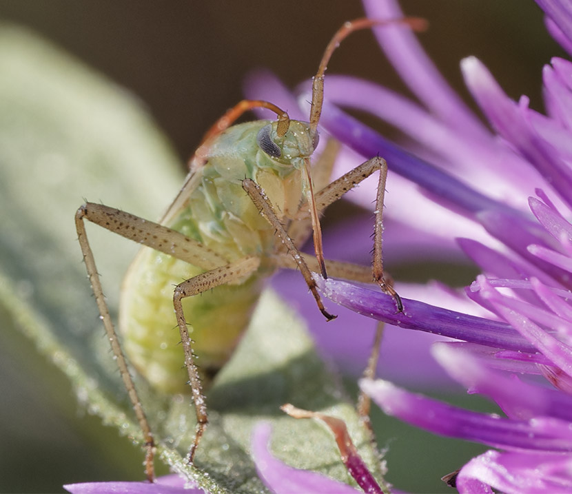 Grüne Wanze auf der Blüte einer Diestel. Einzelfoto mit 10 Blende und 1/200s.