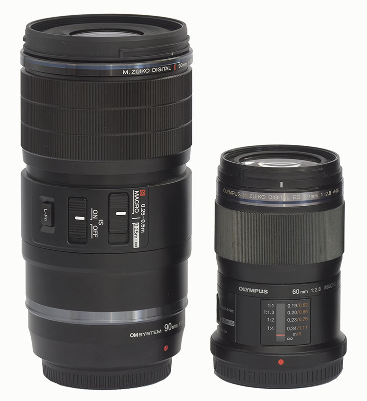 Größenvergleich: Das M.Zuiko Digital ED 90mm F3.5 Macro IS PRO wirkt - obwohl es nicht besonders groß ist - riesig neben dem zierlichen Olympus M.Zuiko Digital ED 60mm 1:2.8.