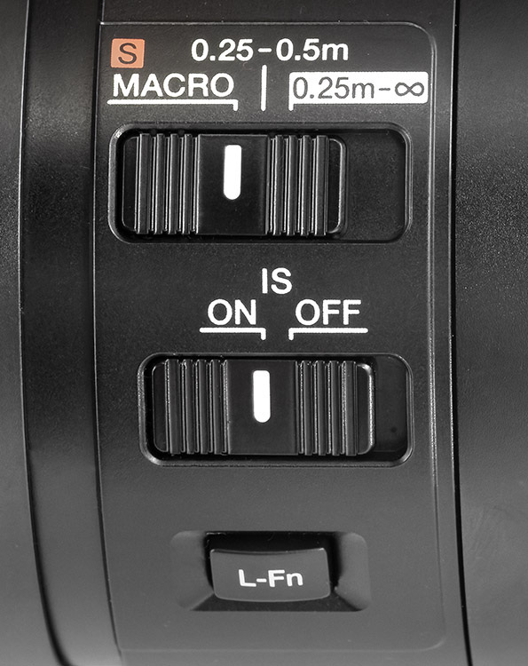 Der Limiter OM System M.Zuiko Digital ED 90mm F3.5 Macro IS PRO hat drei Stellungen. 0,25 m bis unendlich und 0,25-0,5m und S Macro. Darunter befinden sich der Schalter für die Bildstabilisierung und eine Funktionstaste.