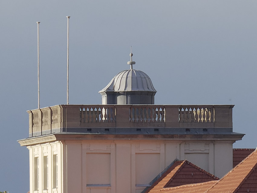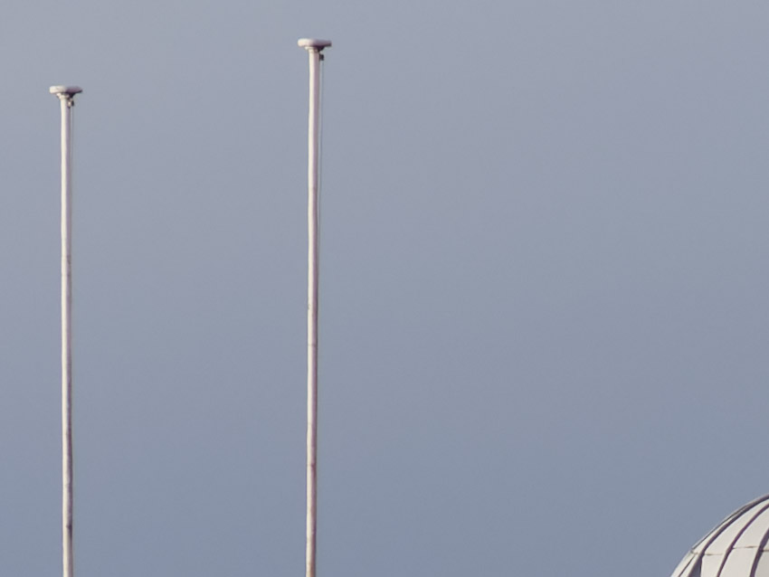 850 x 638 Pixel Ausschnitt. Bei offener Blende ist die Abbildungsqualität beeindruckend. Bei beiden Fahnenmasten sind die Leinen und andere Deteils erkennbar.