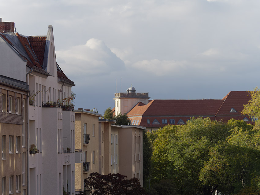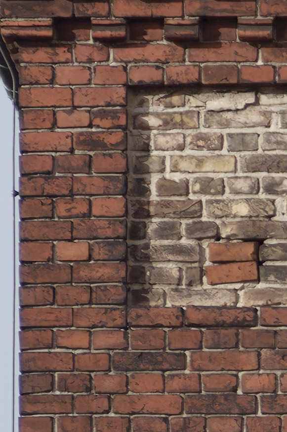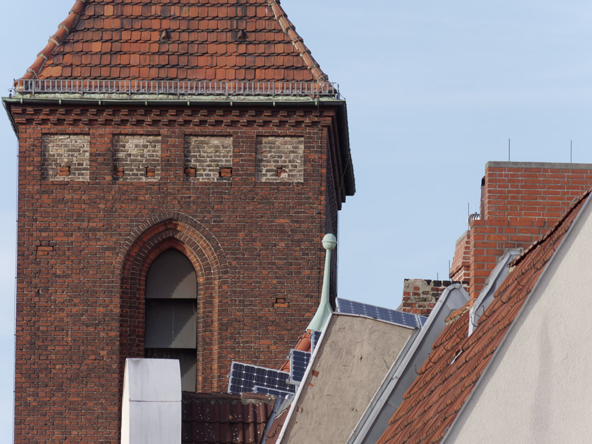 Testmotiv. Glockenturm der Osterkirche in Berlin, Ortsteil Wedding. An den Backsteinen und dem Kabel für den Blitzableiter am linken Bildrand ist die Detailauflösung und das Auftreten von Farbsäumen gut zu prüfen.