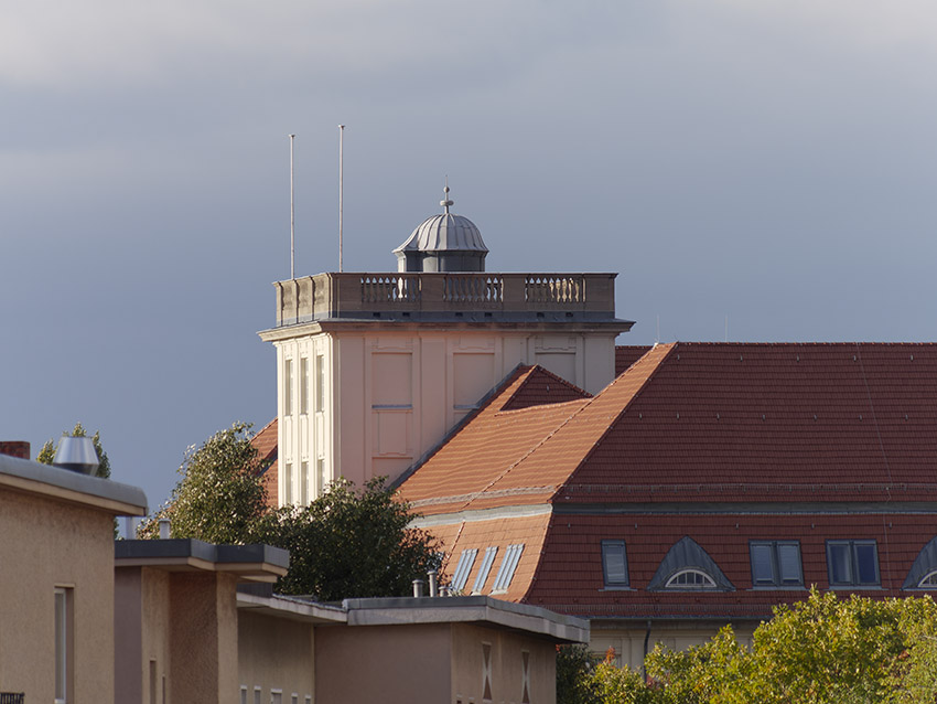 Ganzes Foto. Gebäude mit zwei Fahnenmasten in ca. 600 Metern Entfernung.
