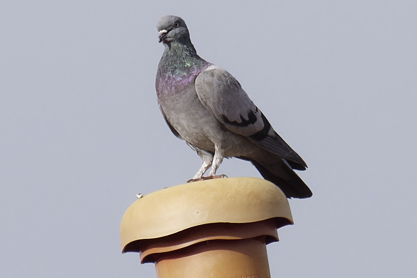 Ausschnitt aus der Bildmitte. Taube auf einem Abzugsrohr. Berlin. 2022.