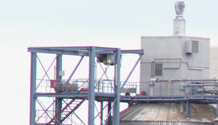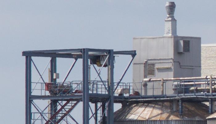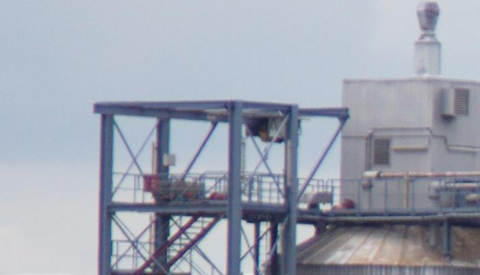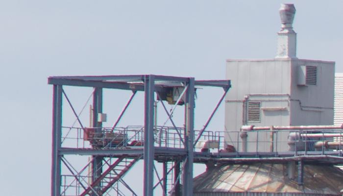 Auf den obigen Bildern der Blüten sind keine Farbsäume erkennbar. Am ehesten sieht man sie an Gegenständen wie Antennen, Zweigen und Gebäudekanten vor dem Himmelshintergrund. Unser Testmotiv ist ein Gerüst bei einem Kraftwerk, das nur mit Optiken mit exzellenter Farbkorrektur, bzw. stark abgeblendet, ohne farbige Kanten wiederzugeben ist.