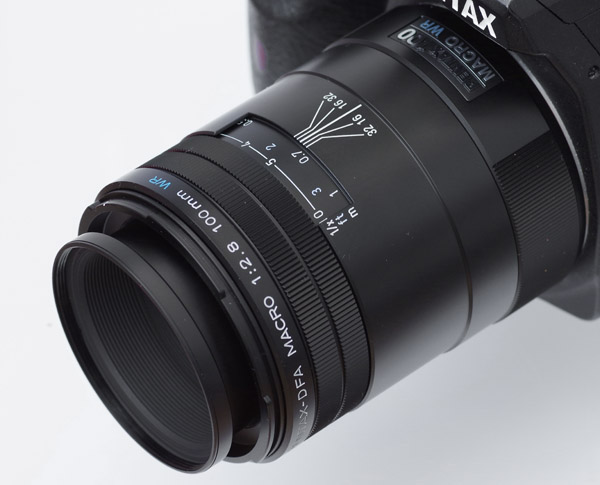© Thomas Gade - August 2015Das smc PENTAX-D FA 1:2.8 100mm MACRO WR ist der Nachfolger des gleichnamigen Objektivs ohne WR, der noch keinen Spritzwasserschutz hatte. Das Objektiv ist vollformattauglich. Durch seinen Metalltubus aus Aluminium macht es einen soliden Eindruck. Wie beim Vorgänger wurde auf einen Blendenring verzichtet. So ist eine Verwendung nur an Kameras mit Blenden-Innensteuerung möglich. Die Frontlinse hat eine spezielle Beschichtung, die das Anhaften von Schmutz behindert. Man kann trotz Autofokus manuell eingreifen und mit dem gerändelten Scharfstellring selber bestimmen, wo die Schärfe liegen soll.