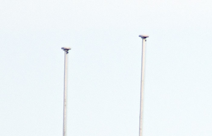 Blende 8 und 1/500 Sekunde. Ausschnitt aus dem Bild. Die Taue an den Fahnemasten sind erkennbar. Es gibt hier nicht den Hauch eines Farbsaums.