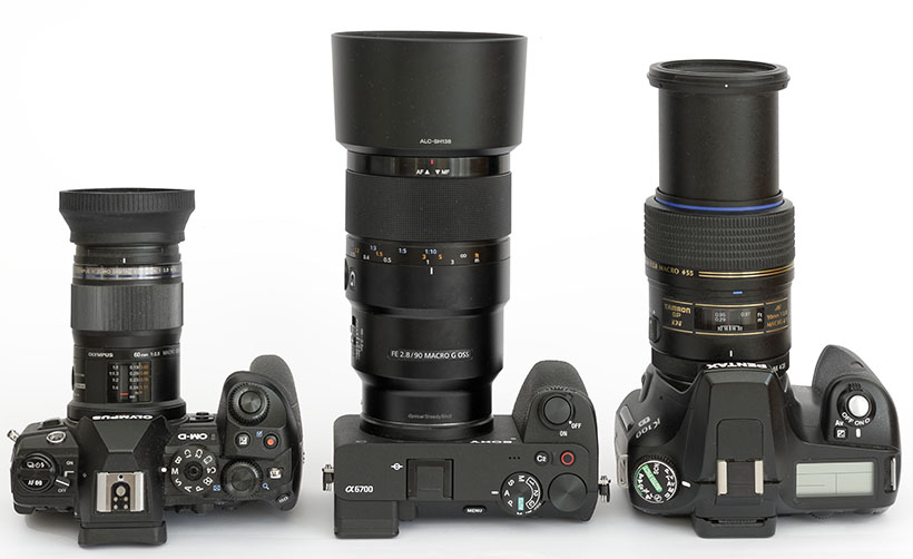 Vergleich: Links Olympus OM-D E-M1 III mit Olympus 60 mm Makroobjektiv, in der Mitte Sony Alpha 6700 mit Sony FE 90mm Macro und rechts eine Pentax DSLR mit einem Tamron SP Di AF 90 mm F 2.8 Makroobjektiv.