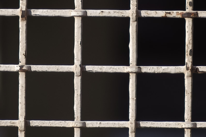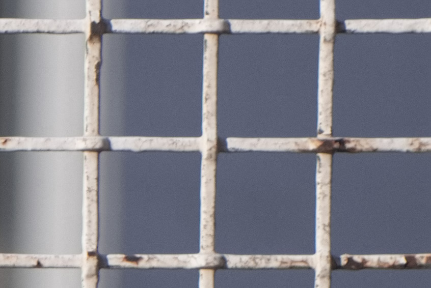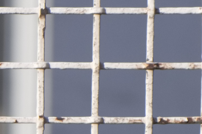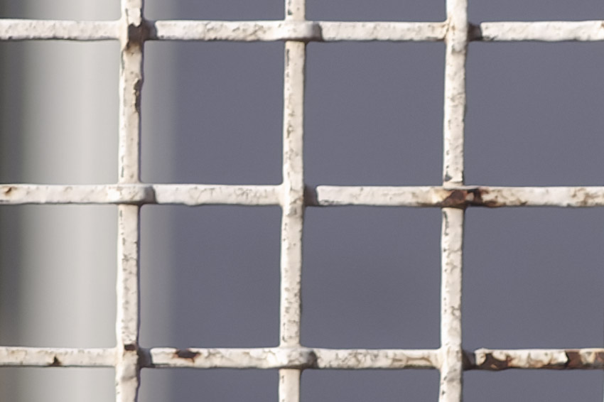 Die Kamera war zum Verlauf der Gitterlinien ein wenig schief eingestellt, sodass horizontale Linien von links nach rechts ein wenig schräg nach unten verlaufen. Auffällige geometrische Verzeichnungen sind am Gitter nicht erkennbar.