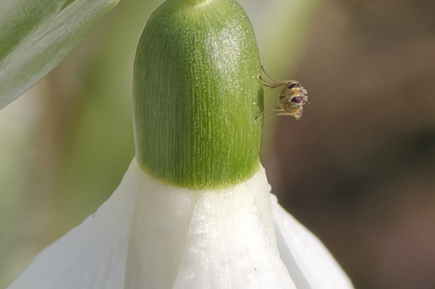 Ausschnitt aus dem Bild. Am grünen Kopf des Schneeglöckchens ist ein kleines Insekt. Das wurde erst beim Betrachten des Fotos entdeckt, aber nicht vor Ort während der Aufnahme.