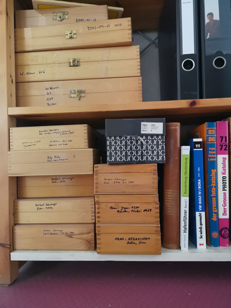 In einem Flur, der nur durch Türöffnungen aus angrenzenden Zimmern Licht erhält, dient ein Teil des Regals im dunklen Bodenbereich als Testmotiv zum Vergleich. Es wird freihand im Standardmodus und ohne Zoom fotografiert.