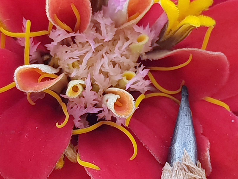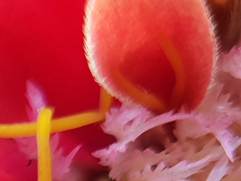 Samsung Galaxy S9 mit dem SIRUI MC-02 Macro Vorsatzobjektiv. Mittig eher unscharf. In der Ecke links unten ist es scharf. Die Aufnahme wurde vom Stativ gemacht und die Pflanze war so fixiert, dass sie sich nicht bewegte. Auch durch Variieren des Abstandes gelang keine bessere Aufnahme.