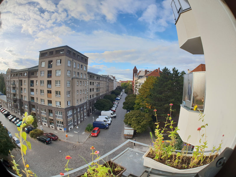 Mit dem Fischauge von SIRUI wird ein sehr großer Bildwinkel aufgenommen, laut Hersteller 170°. Es kann den Sensor des Samsung S9 nicht voll ausleuchten, in den Ecken ist die Grenze zwischen Bildkreis und äußerem schwarzen Rand erkennbar. Entweder behebt man das in der späteren Bildbearbeitung (Photoshop: verkrümmen) oder zoomt digital so weit, bis die dunklen Ecken verschwinden.