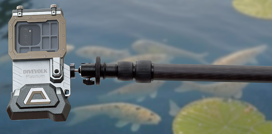 Divevolk Seatouch 4 Max Platinum an einem B.I.G. MC-3M Monopod XXL Carbon (bis 3m Länge ausziehbar). Damit kann man das Smartphone ins Wasser tauchen, z.B. in Teiche mit Fischen.