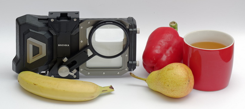 Divevolk SeaTouch 4 Max Unterwassergehäuse mit Nahlinse am Arm der Zubehörklemme. Zum Größenvergleich sieht man eine Tasse Tee, Obst und Paprika.