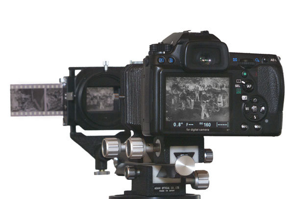 Die Kombination aus Kamera, Balgen, Objektiv und Film-/Diahalter ist simpel. Sie kann bequem auf ein stabiles Stativ geschraubt werden. In der Praxis gehört eine Streulichtblende an das Objektiv, um seitlich einfallenden Licht abzuhalten. Am Diahalter befindet sich ein Balgen, der ausgezogen werden kann, um mit dem Objektiv verbunden zu werden. Dadurch wird jeder seitliche Lichteinfall in das Objektiv und auf die Vorderseite des Filmes ausgeschlossen. Allerdings ist er oft zu kurz, um den langen Zwischenraum zu überbrücken.