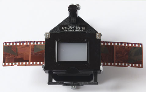 Für einige Balgengeräte gibt es als Zubehör spezielle Halter für Negative und gerahmte 35mm Diapositive. Diese Filmhalter (Diahalter, Diaduplikatoren) ermöglichen das Abfotografieren von Filmen. Das geht erstaunlich gut und ersetzt den Filmscanner. Früher waren Balgengeräte als Diaduplikatoren dafür gedacht, die Bilder vom 35mm Kleinbildfilm im Maßstab 1:1 aufzunehmen. Dafür nutzte man Objektive mit 50 bis 60 mm Brennweite. Für diese Kombination sind die Abmessungen und Verstellwege der meisten Balgengeräte konzipiert.An Kameras mit APS-C Sensor ist die Fläche etwa halb so groß wie das Vollformat (24 x 36 mm). Sie muss deshalb etwas weiter vom Motiv entfernt sein, um es mit der gleichen Brennweite wie für das Vollformat sensorfüllend aufzunehmen. Oder man nutzt Objektive mit etwas längerer Brennweite, wie ein Rodenstock Rodagon D 75mm, das speziell für solche Zwecke gedacht ist. Allerdings kann dann der Verstellweg für die Entfernung zwischen Objektiv und Filmhalter zu kurz sein.