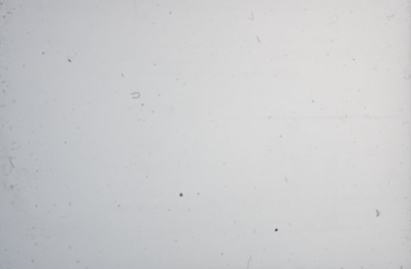 Auf dem Bild ist der Staub auf der Streulichtscheibe sichtbar. Für diese Aufnahme wurde auf ein eingespanntes Dia scharfgestellt. Danach wurde es entfernt und diese Bild aufgenommen. Es ist unübersehbar, dass jedes Staubteilchen auf der nahe beim Film befindlichen Streulichtscheibe mit aufgenommen wird. In diesem Beispiel sieht das dramatischer aus, als es in der Praxis zum Tragen kommt. Berachten wir das an einem abfotografierten gerahmten Dia.